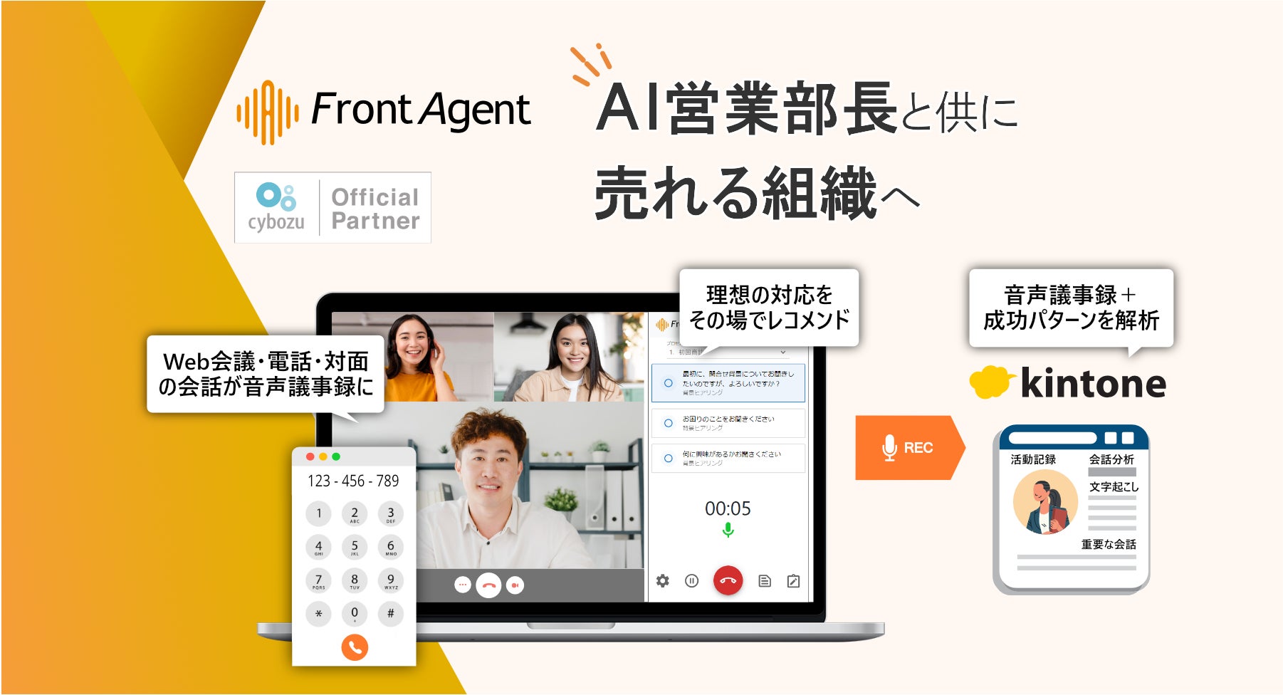 「 Front Agent®」は、オンライン会議と電話の会話から自動文字起こしと成功パターンの解析を行い、会話のアシストAI化する商談アシストプラットフォームです。