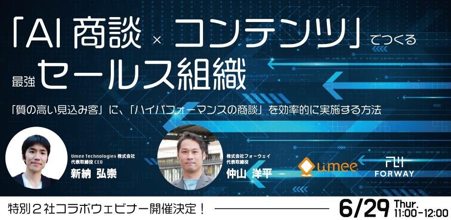 Umee Technologies株式会社(本社:東京都調布市、代表取締役:新納 弘崇、以下ユミー)は、株式会社フォーウェイ(本社:東京都渋谷区、代表取締役:仲山 洋平、以下フォーウェイ)との共催で、中小企業経営者や営業マネージャー向けに、オンラインセミナーを開催します。