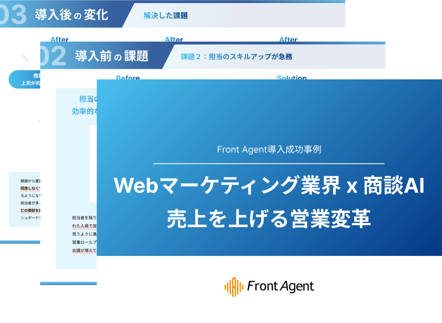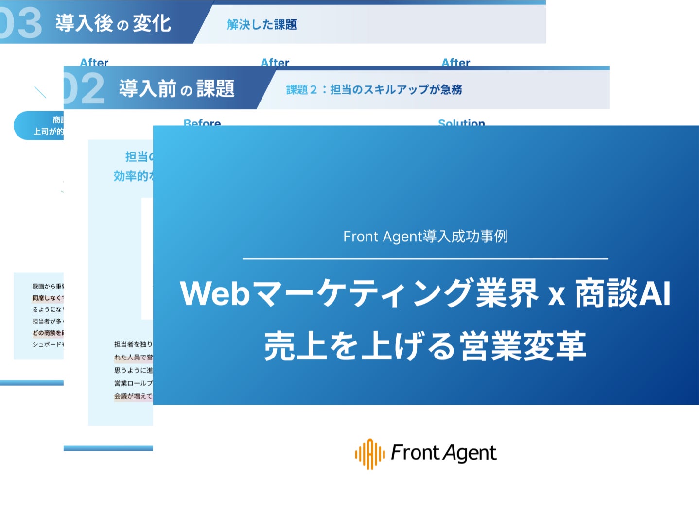 本資料では、商談アシストプラットフォーム「Front Agent®」を導入したところ、営業の脱属人化やより効果的な商談の戦略化を実現した事例を紹介します。また、事例紹介を通して「【Webマーケ x 商談AI】売上を上げる営業変革の成功事例」について解説いたします。